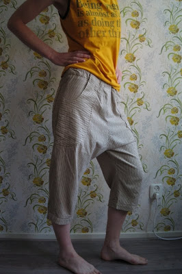 | Anyway, let's talk about the pants! My first low crotch pants ever, and I wasn't sure about them until after they were finished. When I saw the fabric at the market (2,50 a meter!) I knew it was destined to be pants. I used the back of a Burda pattern, but altered the crotch height and the length. I copied the pockets from pants I made a few years ago. Needless to say they are very comfortable, and they can be combined with sneakers as well as with some heels. |